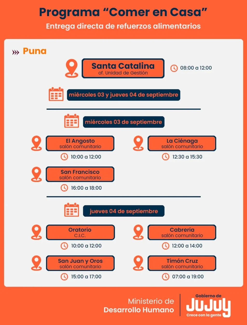 El Ministerio de Desarrollo Humano de Jujuy por medio de la Secretaría de Asistencia Directa, informa que los días miércoles 3 y jueves 4 de septiembre, se llevará a cabo la entrega de módulos alimentarios del Programa “Comer en Casa”, a las familias de Santa Catalina.