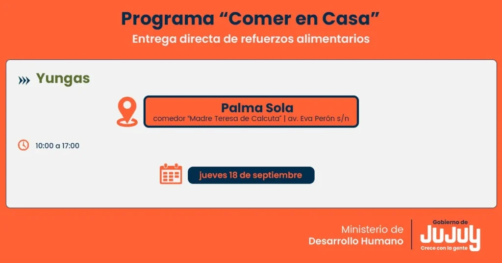 El Ministerio de Desarrollo Humano de Jujuy, mediante la Secretaría de Asistencia Directa, informa que los días jueves 18 y viernes 19 de septiembre, se ejecutará la entrega de unidades alimentarias del Programa “Comer en Casa”, a familias de Palma Sola, El Talar y Vinalito.