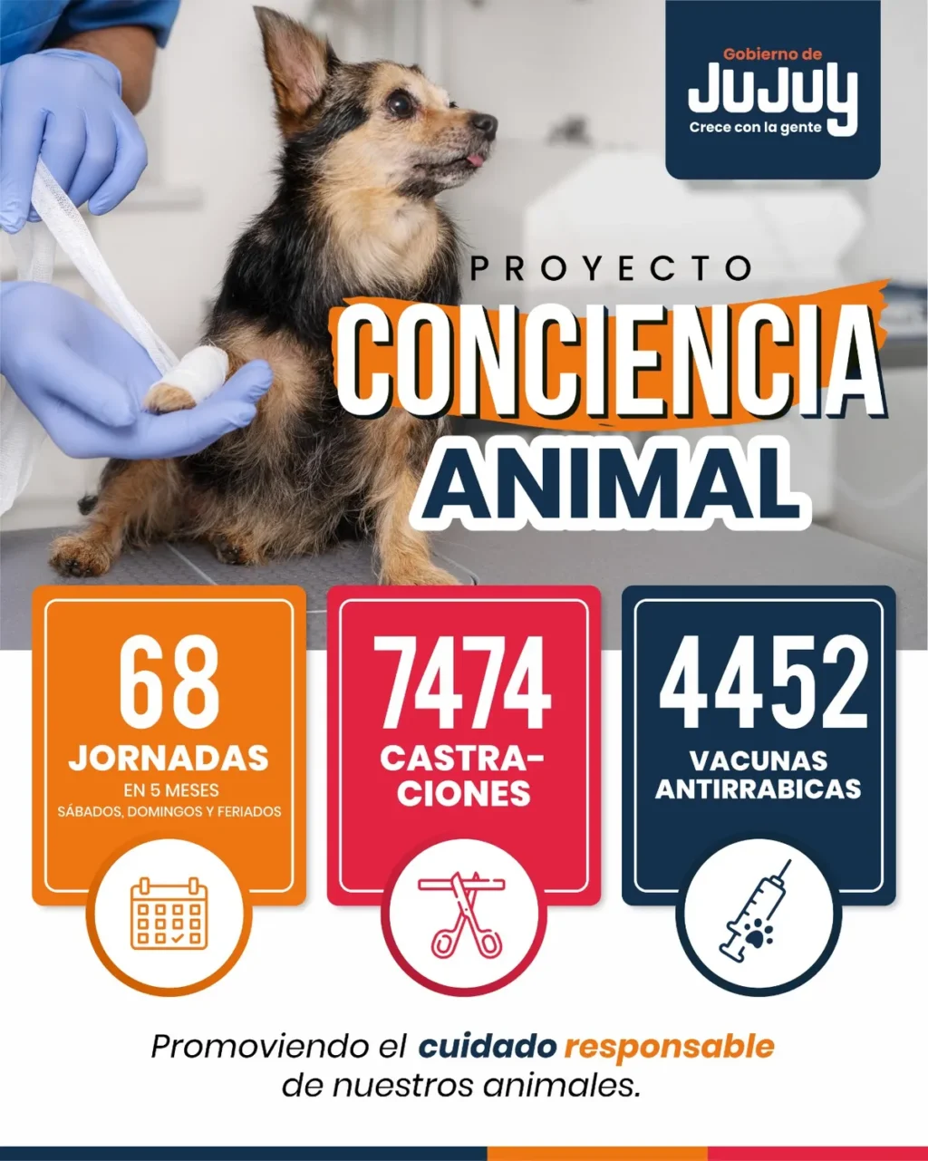 El proyecto "Conciencia Animal", una iniciativa de castraciones y vacunación antirrábica masiva y gratuita para caninos y felinos, ha logrado cifras significativas en sus primeros seis meses de ejecución. La campaña, impulsada por el Gobierno de la Provincia, ha alcanzado un total de 7.474 castraciones y ha inoculado 4.452 vacunas antirrábicas.