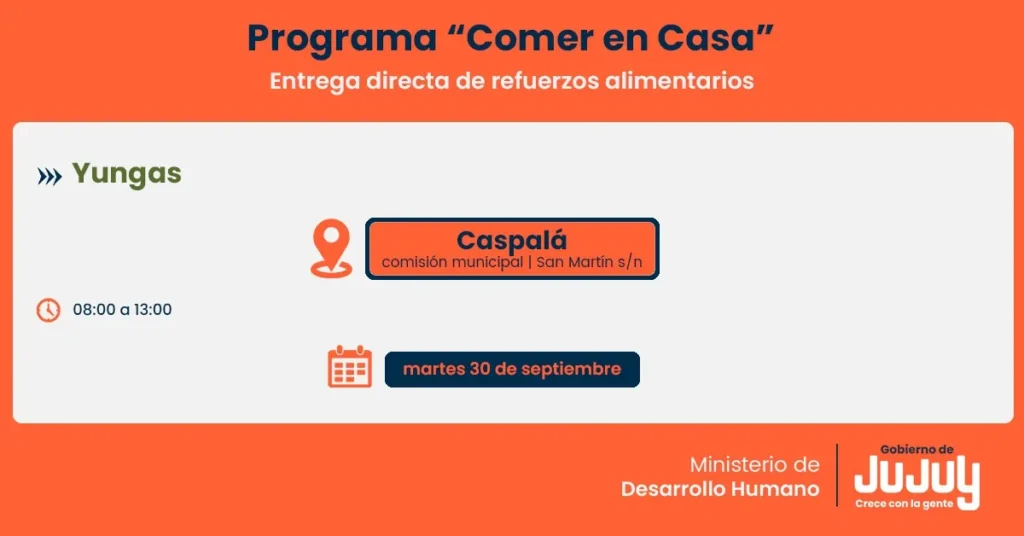 El Ministerio de Desarrollo Humano de Jujuy mediante la Secretaría de Asistencia Directa, informa que desde este martes 30 de septiembre concretará la entrega de refuerzos alimentarios del Programa “Comer en Casa” a familias de Calilegua, Caspalá, Pampichuela, Valle Grande y Yuto.