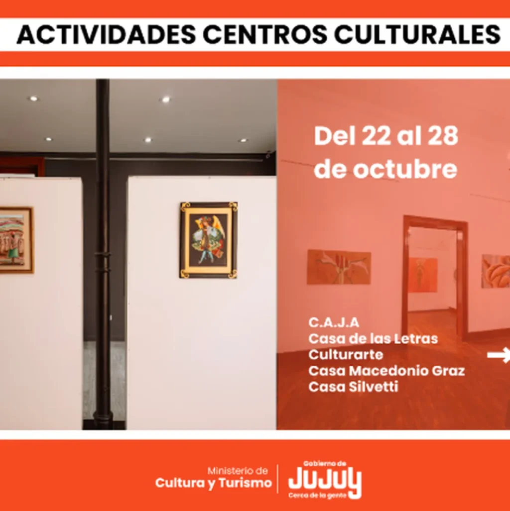 En el Centro Cultural Culturarte continúa la muestra del Salón Provincial de Artes Visuales 6ª edición 2025, abierta al público de 8 a 20 horas, con entrada libre y gratuita. El viernes 24 se dictará un Curso de RCP y Primeros Auxilios, organizado por el Gobierno de Jujuy, la Jefatura de Gabinete, Fundación Padre Pío y Fundación ECCOS, de 18 a 22 horas. La actividad es libre y gratuita, con cupos limitados (inscripción al 388 6115305).