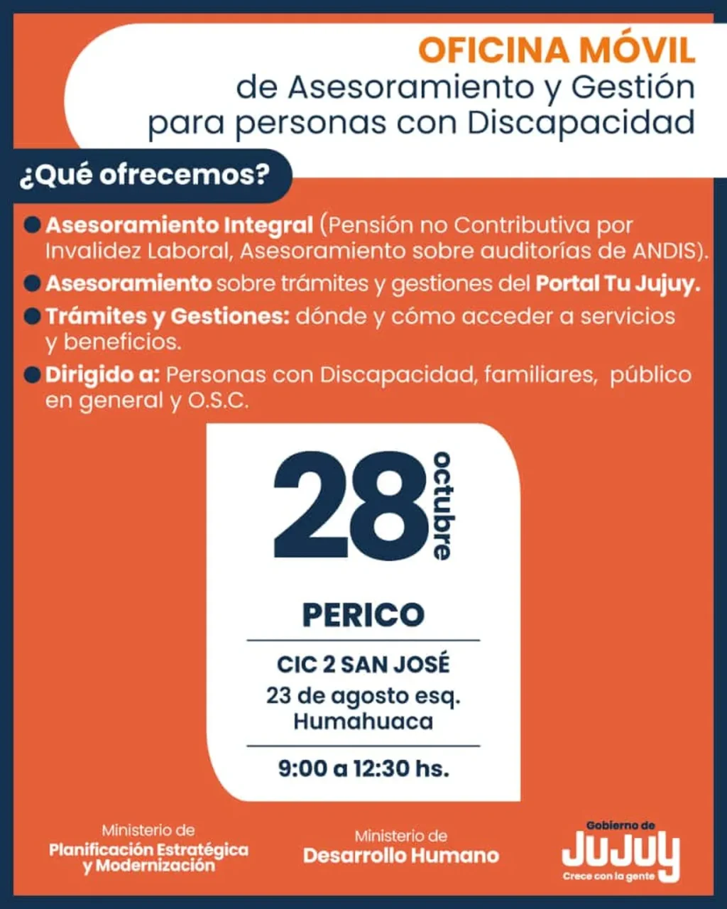 Durante la jornada, se brindará asesoramiento integral sobre Pensiones No Contributivas por Invalidez Laboral, auditorías de ANDIS, y trámites y gestiones a través del Portal Tu Jujuy. Además, se ofrecerá información sobre cómo acceder a distintos servicios y beneficios vinculados a la promoción de derechos y la inclusión.