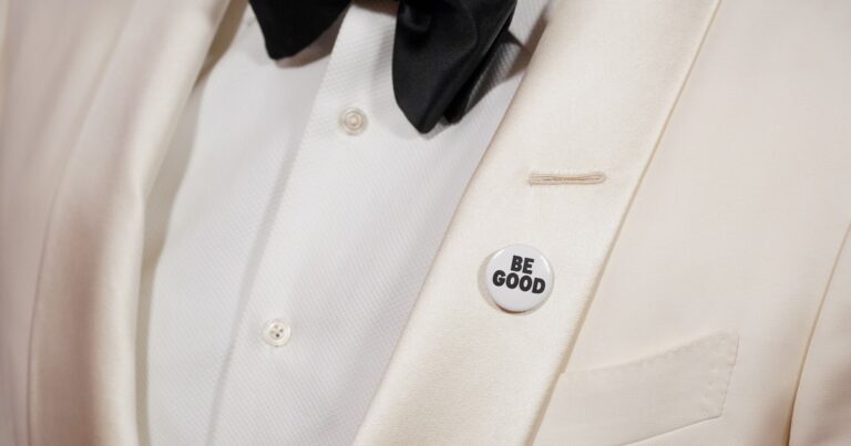 Los pines en blanco y negro mostraban eslóganes como "BE GOOD" y "ICE OUT" (fuera ICE), introduciendo un ángulo político...